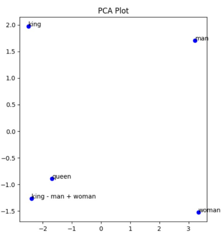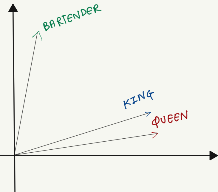Here, the words “king” and “queen” are placed together in the space, whereas “bartender” is away from them, indicating no strong connection. While illustrations often show these embeddings in two dimensions, real-world embeddings commonly have up to 100 or more dimensions. Such high-dimensional spaces allow each vector component to represent distinct features of meaning.