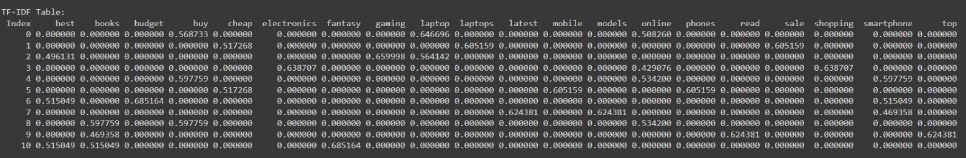 - Data Representation: The resulting matrix is converted into a DataFrame, making it easy to see which words are most “informative” across all search queries.