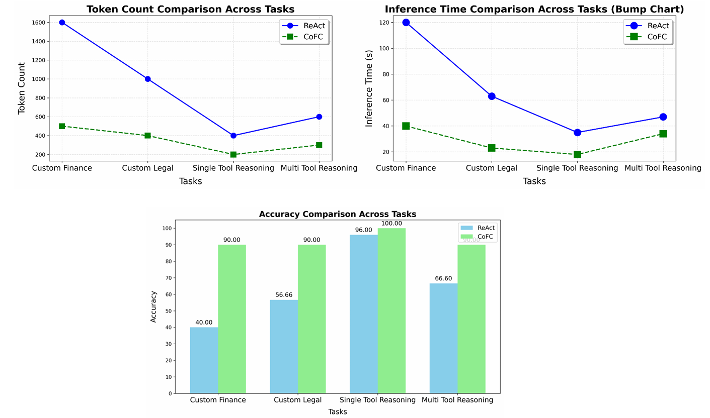 We evaluated custom multi-hop queries on tool reasoning in the Legal and Finance domains using curated datasets: CUAD for legal texts and Finance-10k for financial reports. MetaTool (ICLR 2024), a benchmark for tool usage and selection, was used to test tasks 1 (single-tool reasoning) and 4 (multi-tool reasoning). As a baseline we considered ReAct. Clearly, CoFC is considerably more efficient and also highly accurate. The results are illustrated in the following figures