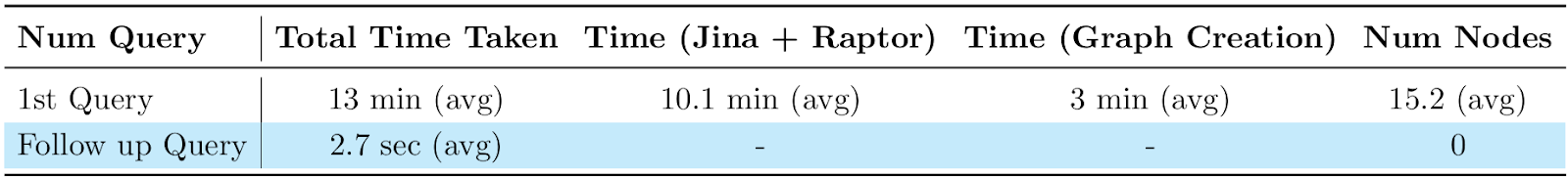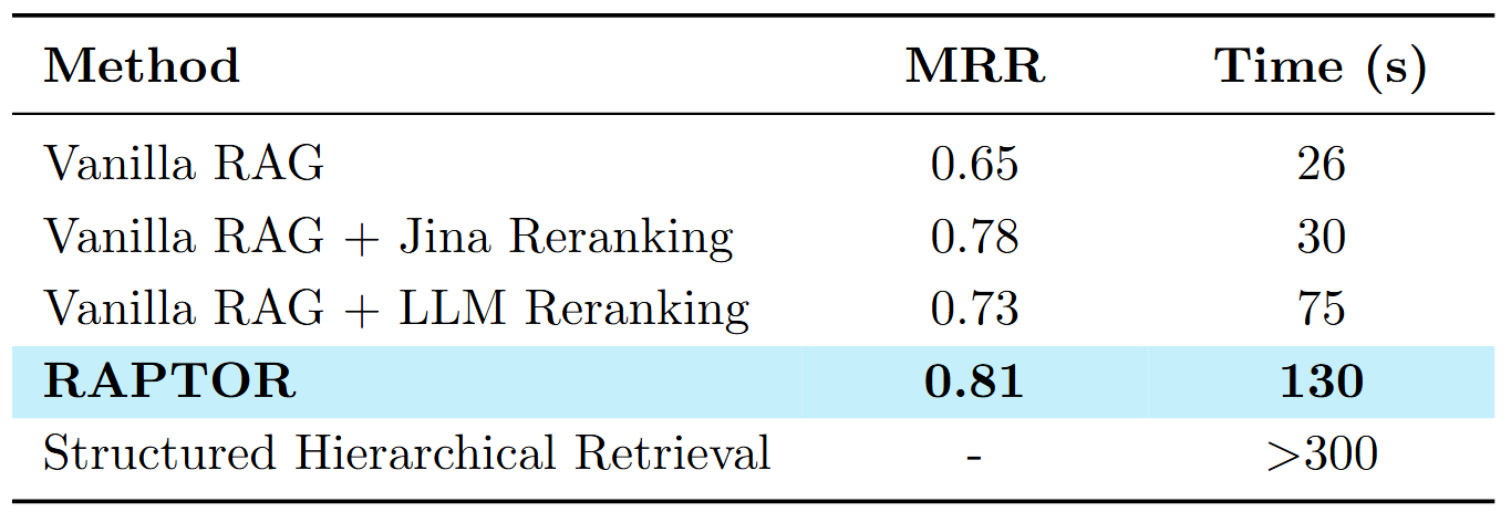 - Vanilla RAG and its variants performed poorly in both Mean Reciprocal Rank (MRR) and time